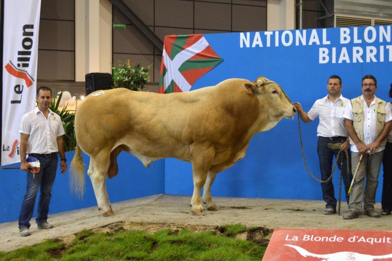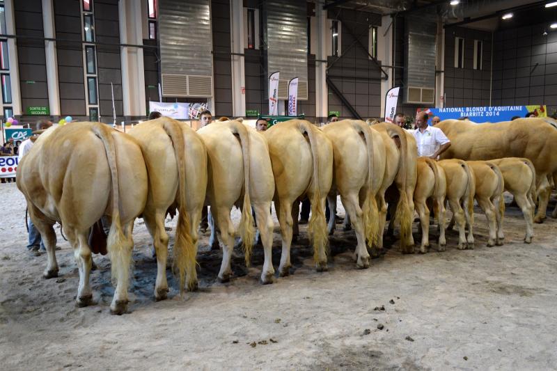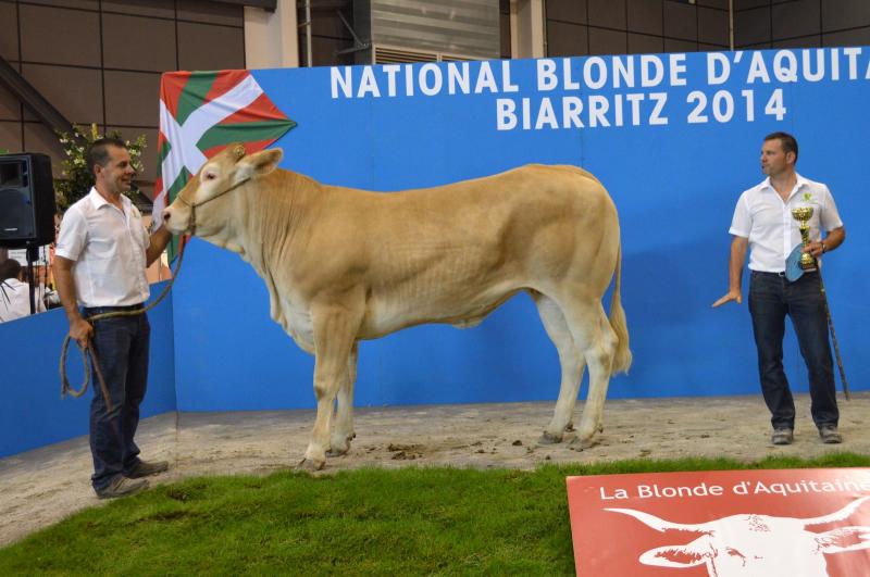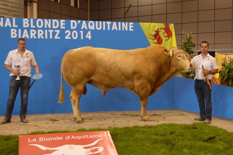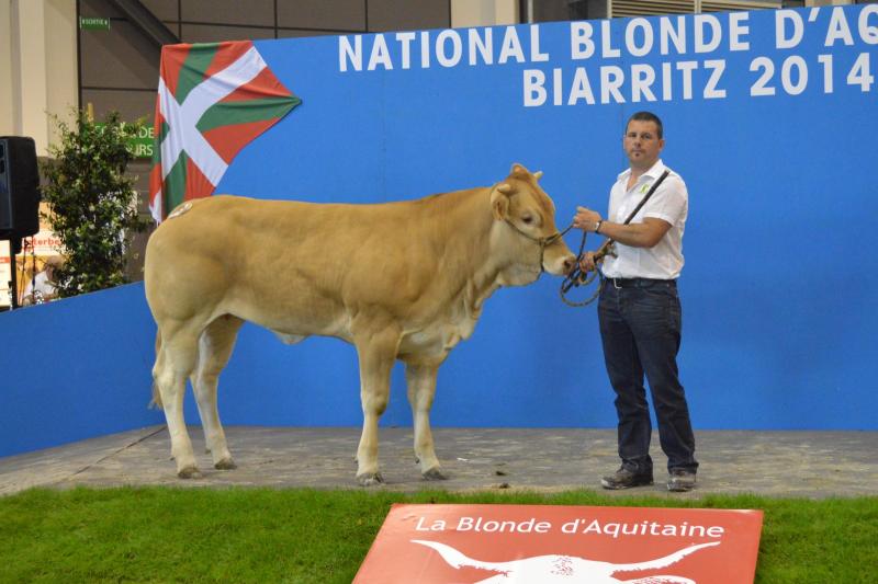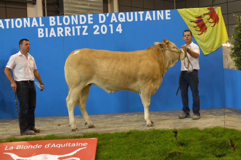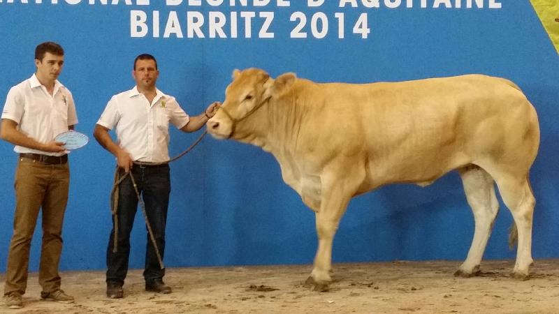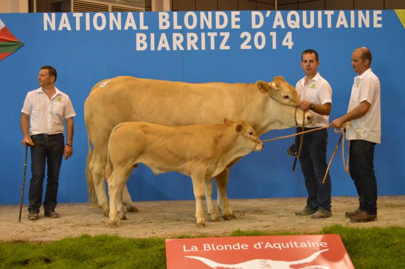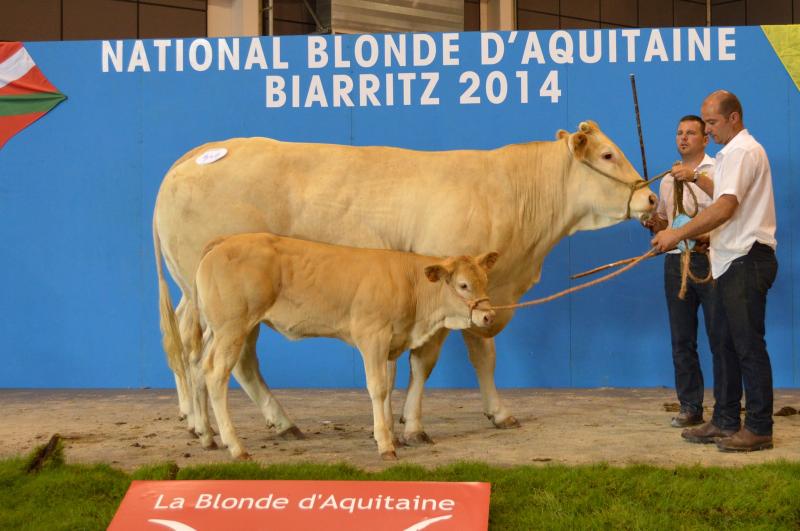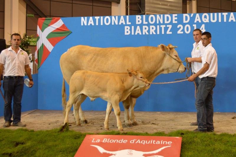Nous avons participé au concours National Blonde d'Aquitaine 2014 de Biarritz avec 24 animaux (2 taureaux, 6 génisses et 8 vaches suitées). Dix de nos animaux sont montés sur le podium avec 4 premiers Prix, 4 deuxièmes Prix et 1 troisième Prix. Nous avons également remporté le Prix Boeuf Blond avec Ghetto, le 2ème Prix de descendance Femelle, le 3ème Prix de descendance Mâle et le 2ème Prix d'Ensemble. Pour finir, 3 de nos animaux ont été préselectionnés pour Paris 2015. La sélection final sera effectuée en Janvier prochain. |